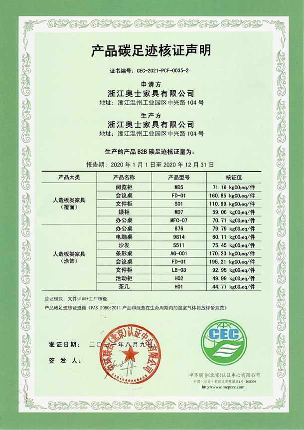 下一篇:浙江奧士家具有限公司-CEC-2021-PCF-0035-1-實木類家具+軟體類家具