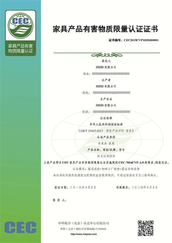 中環聯合認證中心審核(檢查)部結合家具行業市場需求,根據GB/T 35607-2017《綠色產品評價 家具》中產品中有害物質限量的相關要求,編制了《CEC家具產品有害物質限量認證實施規則》(CEC-7004CVP-A/0),現面向家具行業開展CEC家具產品有害物質限量認證業務。