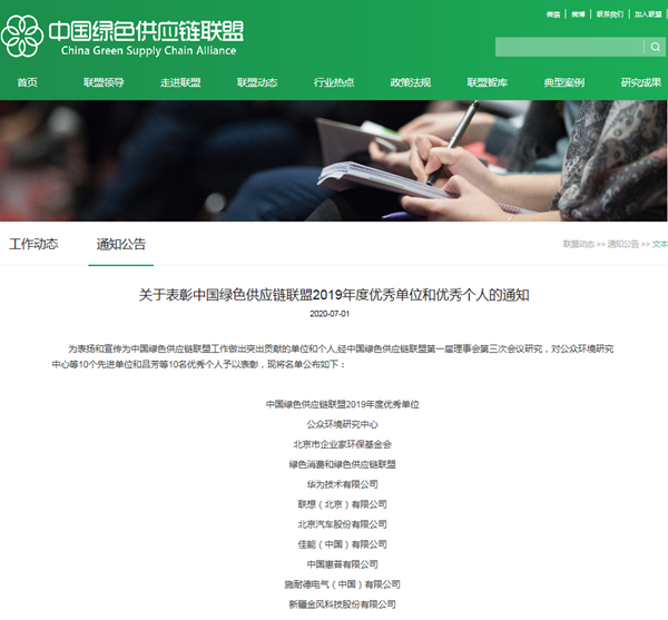 在中國共產(chǎn)黨成立99周年紀(jì)念的日子里,雙綠聯(lián)盟也迎來了好消息。7月1日,中國綠色供應(yīng)鏈聯(lián)盟官網(wǎng)主頁發(fā)布了“關(guān)于表彰中國綠色供應(yīng)鏈聯(lián)盟2019年度優(yōu)秀位和優(yōu)秀個(gè)人的通知”,雙綠聯(lián)盟榮獲“中國綠色供應(yīng)鏈聯(lián)盟2019年度優(yōu)秀單位”稱號。