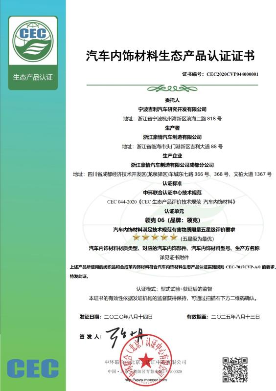 2020年8月14日,中環(huán)聯(lián)合向?qū)幉囇芯块_發(fā)有限公司簽發(fā)了首張“汽車內(nèi)飾材料生態(tài)產(chǎn)品認(rèn)證證書”,吉利生產(chǎn)的“領(lǐng)克06”車型所使用的紡織品和合成革類內(nèi)飾材料經(jīng)評價(jià)滿足技術(shù)規(guī)范有害物質(zhì)限量五星級的要求。