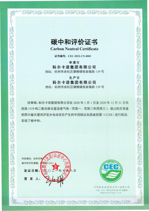 經審核,中環聯合對科爾卡諾集團有限公司開展的碳中和實施情況進行了評價,確認其碳中和實施過程和結果符合相關標準的要求,于2021年7月簽發了首張家具企業碳中和評價證書。目前,中山華盛、世紀京泰、黎明文儀等家具行業龍頭企業也正在積極響應CEC的家具行業碳中和計劃。