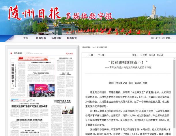 1.隨州日報《“接過旗幟繼續奮斗!”——青年黨員返鄉與老黨員共慶黨的百年華誕》鏈接:http://szrb.suiw.cn/szrb/20210703/html/content_20210703003001.htm