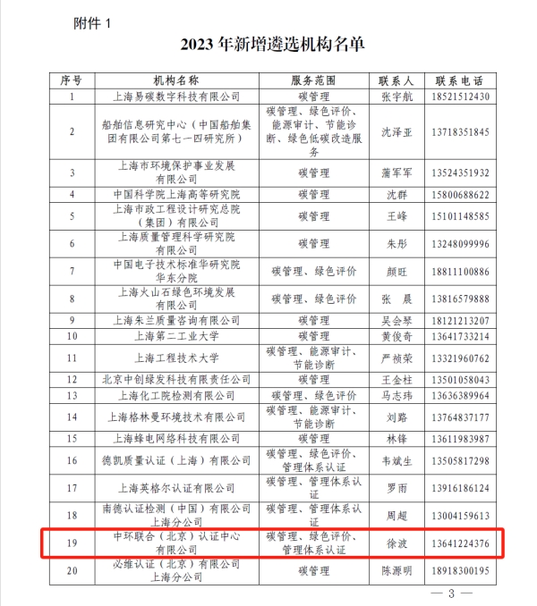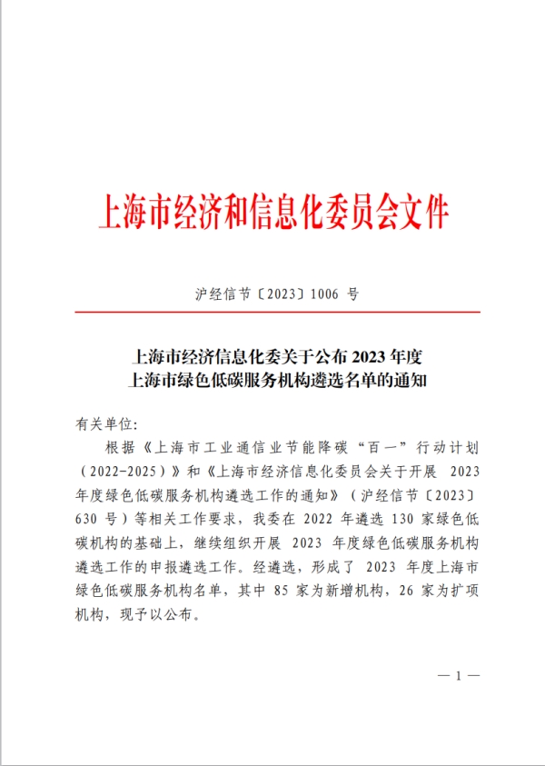 2023年11月20日,上海市經濟和信息化委員會發布了《上海市經濟信息化委關于公布2023年度上海市綠色低碳服務機構遴選名單的通知》(滬經信節【2023】1006號),中環聯合(北京)認證中心有限公司(以下簡稱CEC)成功入選,成為上海市碳管理、綠色評價、管理體系認證的第三方服務機構。