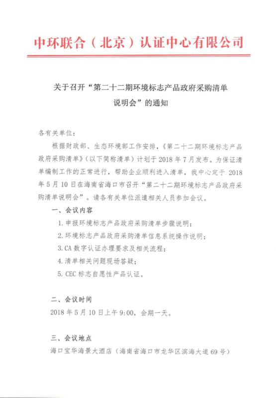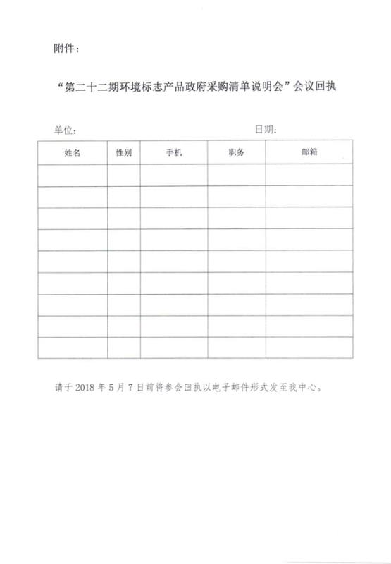 “第二十二期環境標志產品政府采購清單說明會”會議回執