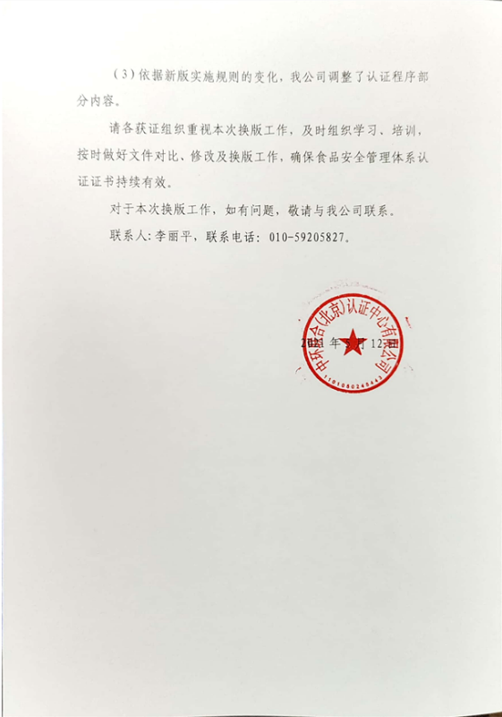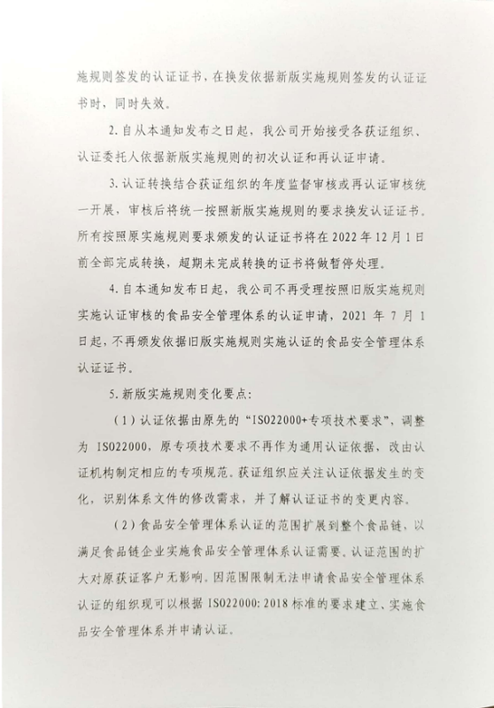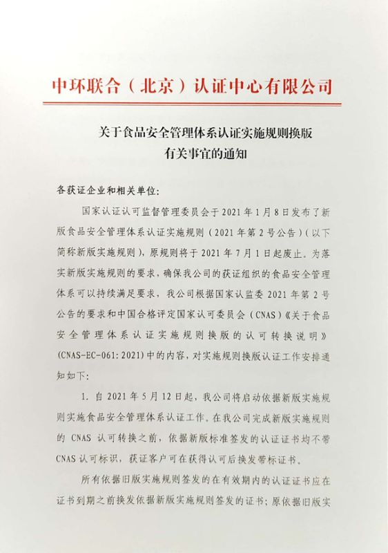 關(guān)于食品安全管理體系認(rèn)證實(shí)施規(guī)則換版有關(guān)事宜的通知