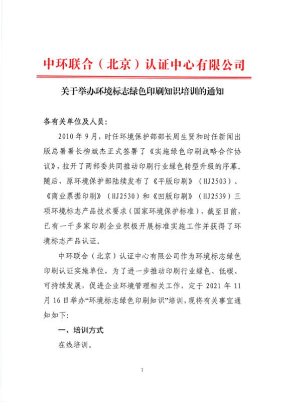 關于舉辦國環境標志綠色印刷知識培訓的通知