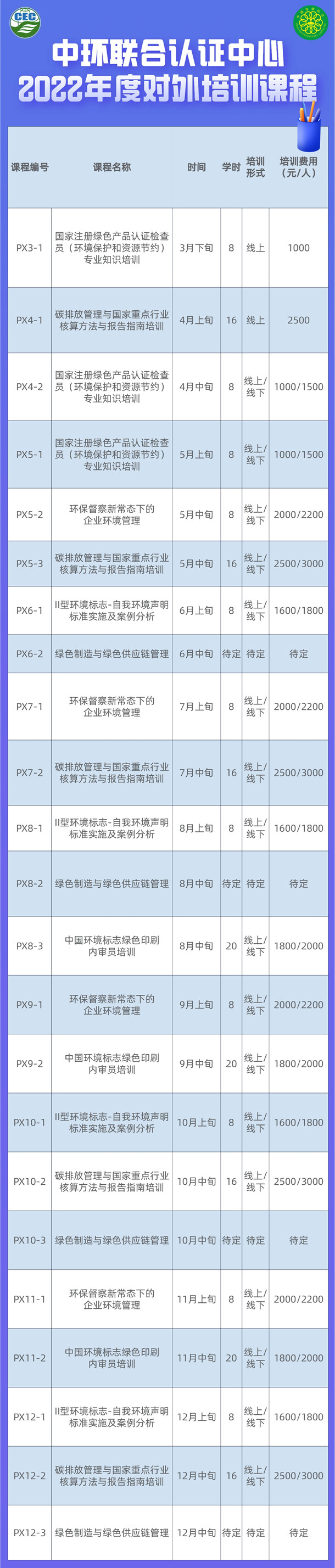 2022年中環(huán)聯(lián)合認(rèn)證中心將迎來20周歲。二十年來,中環(huán)聯(lián)合始終致力于為國家生態(tài)文明建設(shè)服務(wù),積極開展環(huán)保節(jié)能低碳發(fā)展策略和解決方案研究,不斷完善和創(chuàng)新綠色產(chǎn)業(yè)評(píng)價(jià)體系,服務(wù)于行業(yè)綠色發(fā)展轉(zhuǎn)型。通過獨(dú)立、公正、高質(zhì)量的評(píng)價(jià)與認(rèn)證,服務(wù)于政府、企業(yè)及公眾,為其搭建綠色生產(chǎn)與消費(fèi)溝通的橋梁。為回饋長期支持和幫助中環(huán)聯(lián)合的社會(huì)各界朋友和廣大客戶,中環(huán)聯(lián)合認(rèn)證中心特推出系列培訓(xùn)課程優(yōu)惠活動(dòng)。