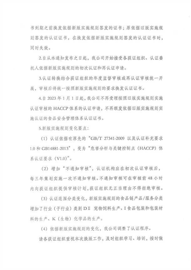 關于危害分析與關鍵控制點(HACCP)體系認證實施規則換版有關事宜的通知