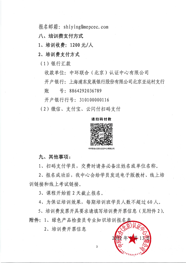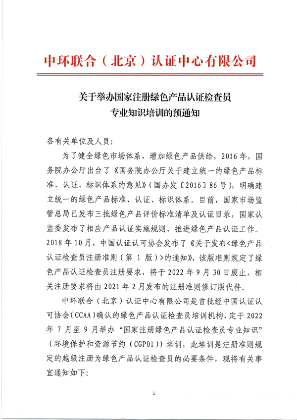 關于舉辦國家注冊綠色產品認證檢查員專業知識培訓的預通知
