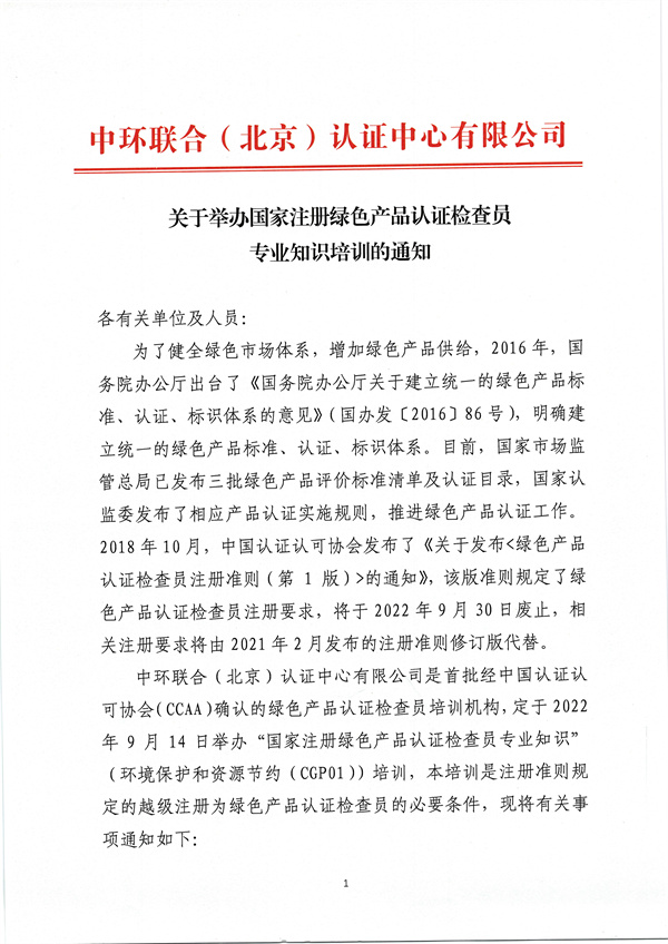 9月14日國家注冊綠色產品檢查員專業知識培訓通知