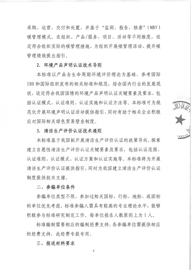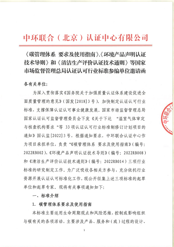 《碳管理體系 要求及使用指南》、《環境產品聲明認證技術導則》和《清潔生產評價認證技術通則》等國家市場監督管理總局認證認可行業標準參編單位邀請函