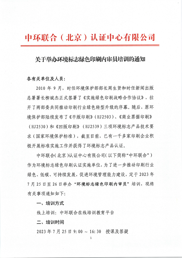 關于舉辦環境標志綠色印刷內審員培訓的通知